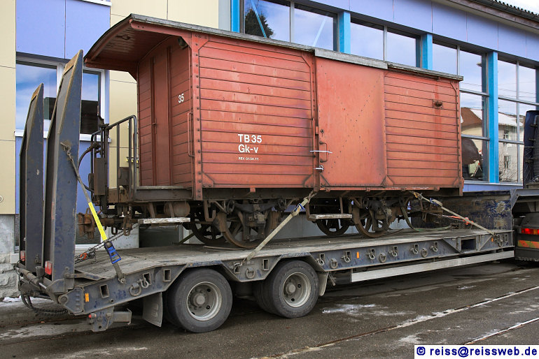 TB 35, ein gedeckter Güterwagen der Trogenerbahn mit der Bezeichnung Gk-v, verlässt am 04.01.2008 seine Heimatregion mit Ziel Bern (Aufnahme in Speicher).