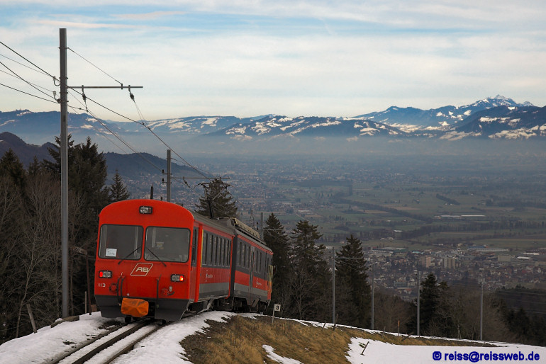 | Der Zahnstangenabschnitt auf der Linie Altstätten - Gais der Appenzeller Bahnen ist beim Bahnübergang Kreuzstrasse unterbrochen. BDeh 4/4 Nr. 16 mit Steuerwagen 113 ist soeben in den Zahnstangenabschnitt unterhalb des Bahnübergangs eingefahren (04.01.2008). |