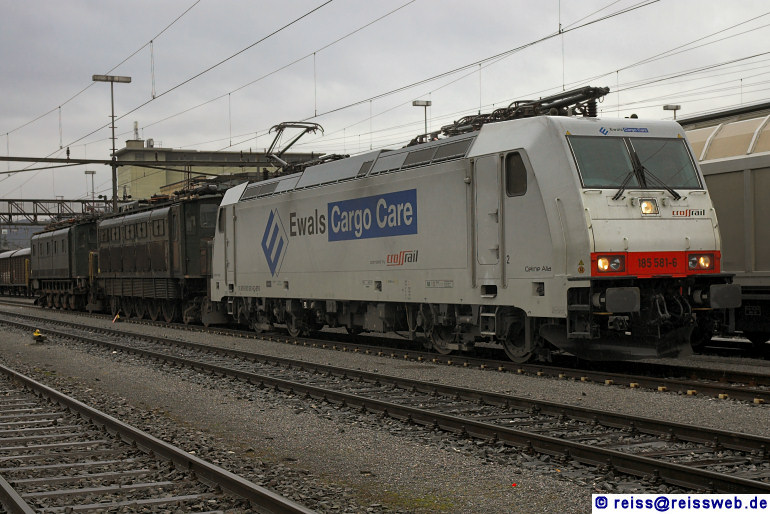Am 09.01.2008 wurden die beiden Ae 4/7 10948 und 11002 von Bodio nach Winterthur überführt, Zuglok war die für Crossrail fahrende 185 581 in der "Ewals Cargo Care"-Lackierung (Aufnahme in Winterthur Gbf).