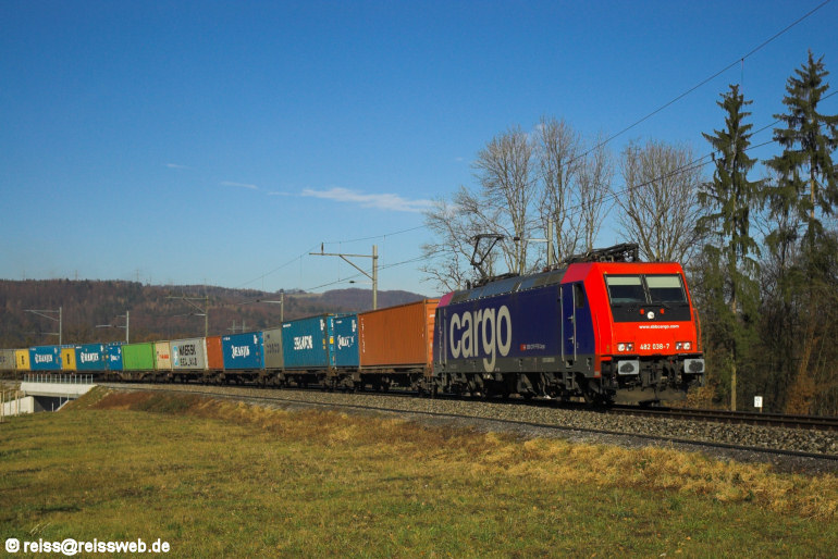 482 038 ist mit einem Containerzug zwischen Koblenz und Zurzach unterwegs, Ziel des Zuges ist Rekingen (23.01.2008).