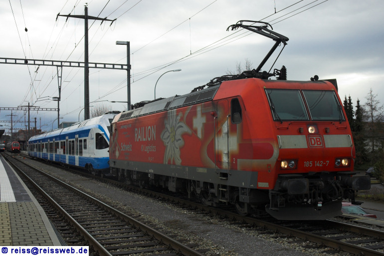 | Am 06.02.2008 wurde der 1. Flirt für die Stadtbahn Algier von Bussnang nach Basel St. Johann überführt, dort werden die ersten Testfahrten unter 25 kV/50 Hz durchgeführt. Zuglok war Railion 185 142 in der speziellen Lackierung (Aufnahme in Weinfelden). |