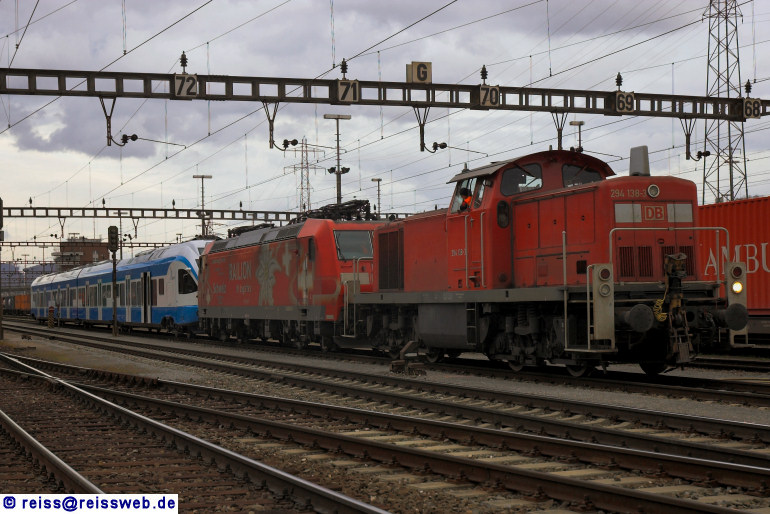 In Muttenz wurde für die restlichen km nach Basel St. Johann 294 138 als Zuglok beigestellt - 185 142 könnte zwar technisch unter 25 kV/50 Hz verkehren, sie hat jedoch keine Zulassung (06.02.2008).