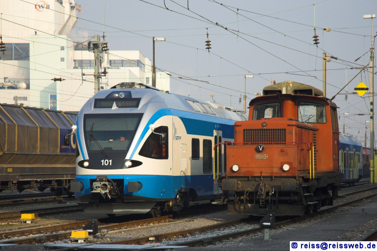 Nebeneinander warten in Basel St. Johann SBB Cargo Em 3/3 18809 und der für Algerien bestimmte Flirt (RBe 91 92 9 541 101-2) auf ihre nächsten Aufgaben (14.02.2008).