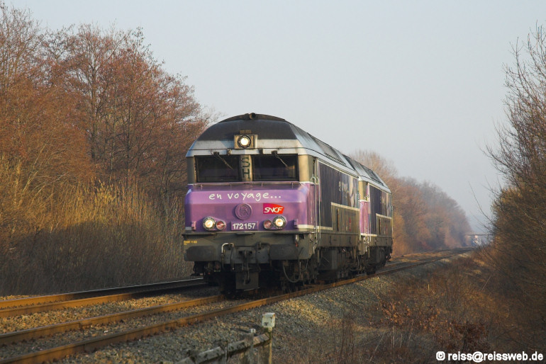 Als Lokzug (franz.: HLP "haut-le-pied") kehren CC 72157 & 72172 am späten Nachmittag des 14.02.08 von Mulhouse nach Chalindrey zurück - die Aufnahme entstand im "letzten Licht" bei Bas-Évette.
