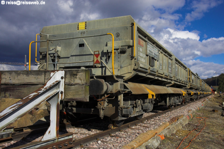 Der entladene Zug mit 7 Wagen wartet auf die Rückfahrt nach Schaffhausen. In einem späteren Abschnitt werden 16-Wagen-Züge gefahren, das Entladegleis wird entsprechend verlängert (Wilchingen-Hallau, 04.03.2008).
