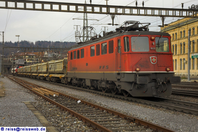Mit Ae 6/6 11432 an der Zugspitze und Am 843 094 am Zugschluss verlässt ein Aushubzug in den Klettgau die Station ZH-Oerlikon (07.03.2008).