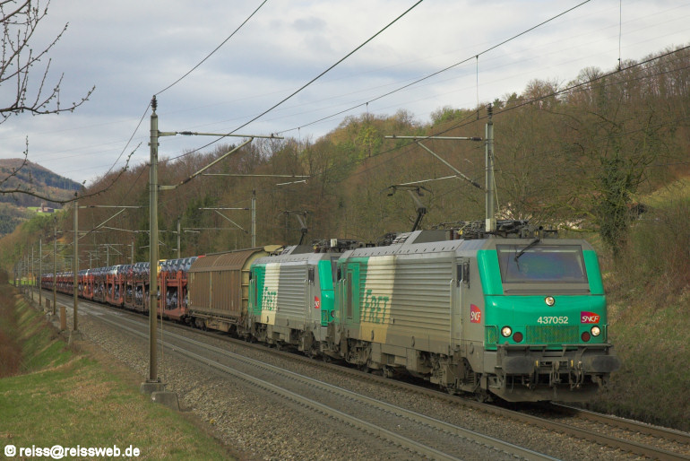 Zusammen mit einer Schwestermaschine befördert BB 37052 den sonntäglichen Güterzug 44701 Mulhouse - Buchs (SG) über den Bözberg, die Aufnahme entstand an der bereits bekannten Fotostelle oberhalb Umiken (16.03.2008).