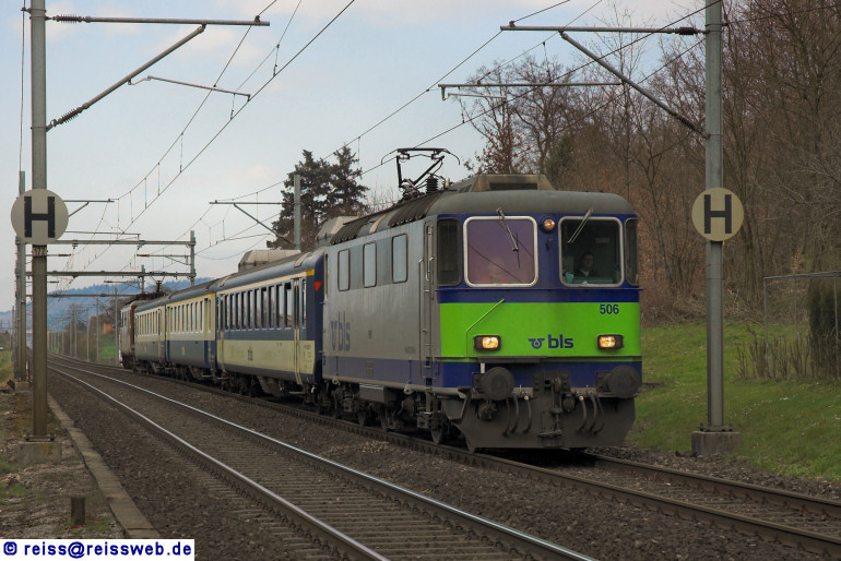 Der BLS-Charterzug mit 420 506 an der Spitze und mit Re 4/4 191 am Zugende ereicht in Kürze Sursee, weiter geht die Fahrt auf der nicht elektrifzierten Strecke nach Triengen (05.04.2008).