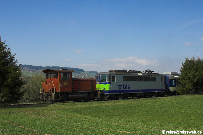 Genau zwischen die Bäume passten BLS 420 506 und ST Tm IV Nr. 2, als sie beim Fotohalt in Triengen langsam wieder an die Haltestelle Flugplatz zurückfuhren (05.04.2008).