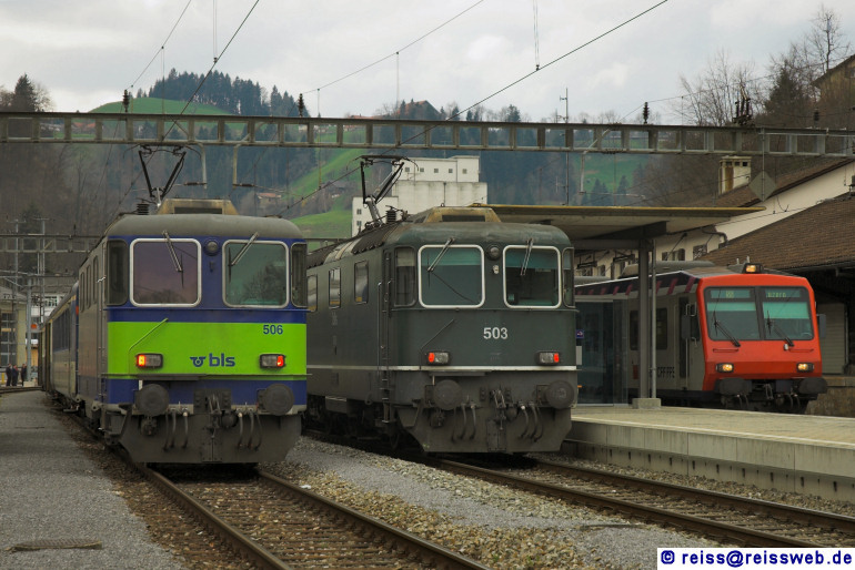 In der Station Wolhusen treffen ein RBDe 561 (ex Thubo-NPZ) und ein RE Luzern - Bern mit BLS 420 503 auf den Sonderzug, der auf dem bahnsteiglosen Gleis 4 eingefahren ist und hier Lokwechsel vornehmen wird (05.08.2008).