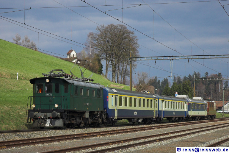 Der BLS-Charterzug verlässt die Station Hüswil im Kanton Luzern, nur noch wenige m, dann ist der Kanton Bern erreicht. Ein kurzes Wolkenloch bescherte ein annehmbares Bild (05.04.2008).