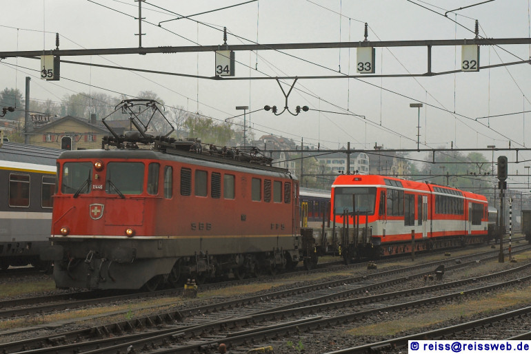 | Am 24.04.2008 wurde der letzte von 5 Gelenktriebzügen (3x ABDeh 4/10, 2x ABDeh 4/8 ) für die Matterhorn-Gotthard-Bahn (MGB) von Bussnang nach Landquart überführt, die Weiterfahrt nach Brig findet auf eigener Achse statt, eine weitere Aufnahme siehe in dieser Galerie. |