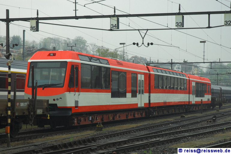Für den Transport nach Landquart wurde der MGB ABDeh 4/8 als ganzes Fahrzeug auf 3 Tiefladewagen verladen (Rorschach, 24.04.2008).