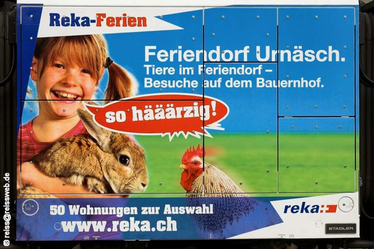 Werbeanschrift "REKA Feriendorf Urnäsch" auf GTW 2/8 526 789 (dem ehemaligen 526 717). Die Werbung der anderen Seite siehe