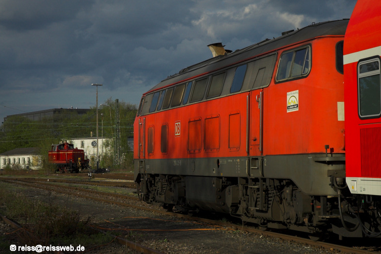 Auf der Neckar-Alb-Bahn Stuttgart - Tübingen werden ab Sonntag 27.04.08 moderne Doppelstockwagen eingesetzt - zu einem Festakt am 25.04. im Bw Tübingen überführte 218 439 die Wagen aus Ulm. Im Hintergrund rangiert die altrote 364 858.