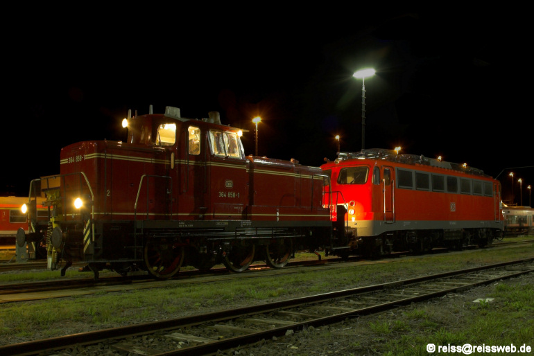 Nachtdienst im Bw Tübingen - die altrote 364 858 hat 110 494 zur Wäsche gebracht und fährt mit ihr zurück unter die Fahrleitung (25.04.08).