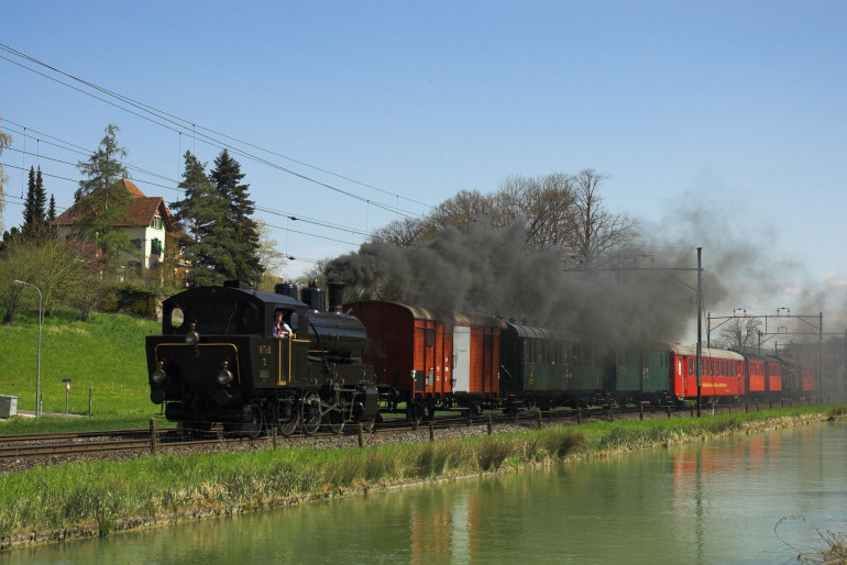 An der klassischen Fotostelle in Bürglen am Kanal wurde Ec 3/5 Nr. 3 vom "Verein Historische Mittel-Thurgau-Bahn" mit ihrem Sonderzug von Romanshorn nach Bussnang abgelichtet (26.04.2008).