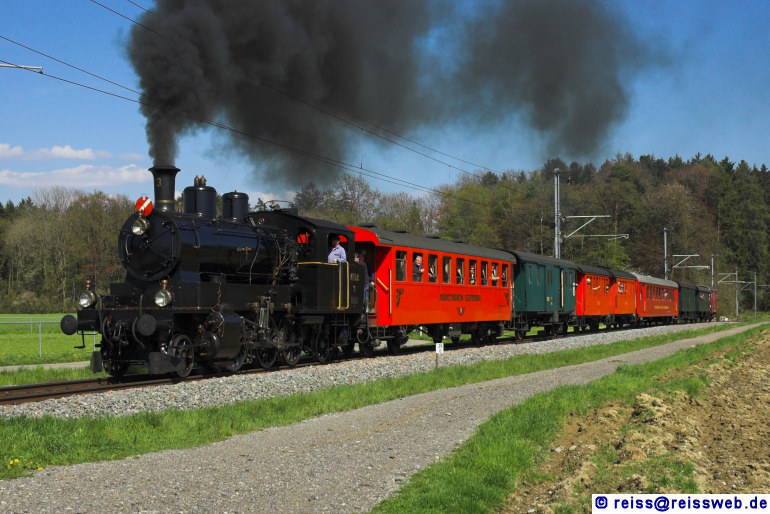 MThB Ec 3/5 Nr. 3 hat soeben die Steigung von Weinfelden hinauf nach Berg geschafft und fährt nun weiter Richtung Kreuzlingen - Romanshorn (Berg, 26.04.2008).