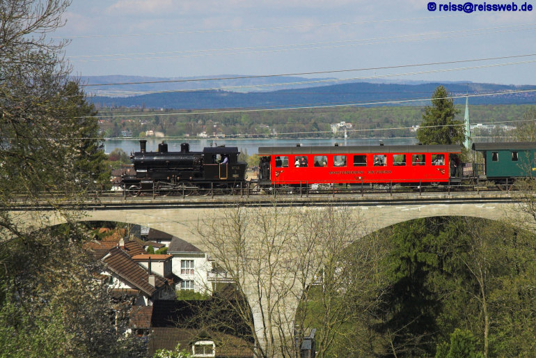 Kurz vor der Station Kreuzlingen-Bernrain überquert der Sonderzug mit MThB Ec 3/5 eine Brücke, die eine kurzen Blick auf den See ermöglicht (26.04.2008).