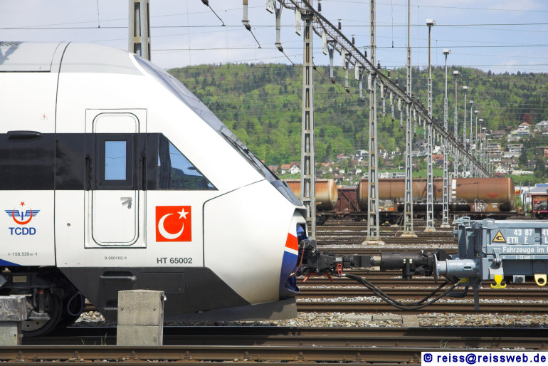 Der TCDD-Triebwagen war zwischen 2 Schutzwagen gekuppelt, interessanterweise hatte man die Garnitur an vorderster Stelle im Zug eingestellt. Die weitere Last bestand aus leeren Autotransportwagen (ca. 40 Achsen), Aufnahme im RB Limmattal (30.04.08).
