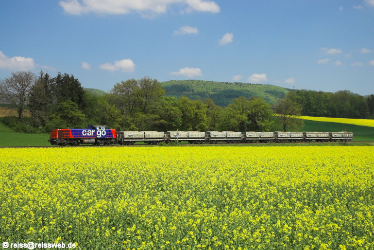 Rapsblüte im Klettgau - während die Wolken am Standort des Fotografen ihre Schattenspiele trieben, kam Am 843 094 mit einem der Aushubzüge glücklicherweise in einem sonnigen Moment vorbei (Neunkirch, 06.05.2008).