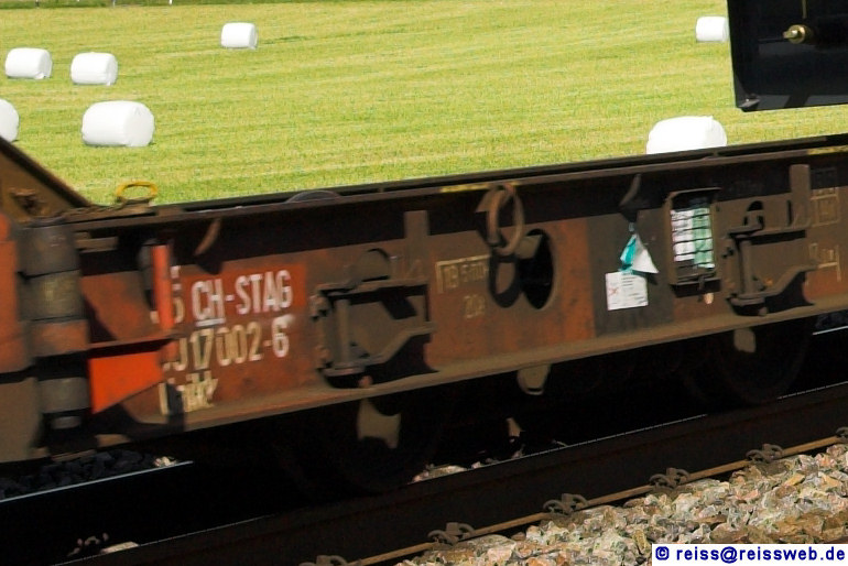 Den Anschriften nach (85 CH-STAG) sind die Tiefladewagen vom Typ Uaikk ins Eigentum der Fa. Stadler übergegangen - vermutlich hatte SBB Cargo keine Zukunft für diese Wagen gesehen (Bassersdorf, 13.05.2008).