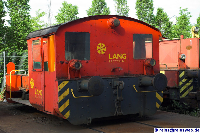 Im Jahr 2008 schon kaum mehr eingesetzt, steht die ehemalige Köf II 4262 der DB (später als 321 504 bezeichnet) der Fa. Lang-Recycling an der hinteren Hallenausfahrt. Die Maschine wurde 1969 von der DB ausgemustert (Gaggenau, 15.05.2008).