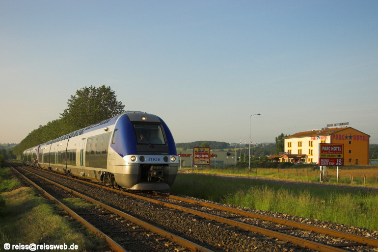 Im frühen Morgenlicht des 23.05.2008 fährt eine B81500-Doppeleinheit mit B81656 an der Spitze auf Le Coteau zu. Ziel des Zuges ist die Stadt Roanne, beide Städte werden nur durch die Loire getrennt.