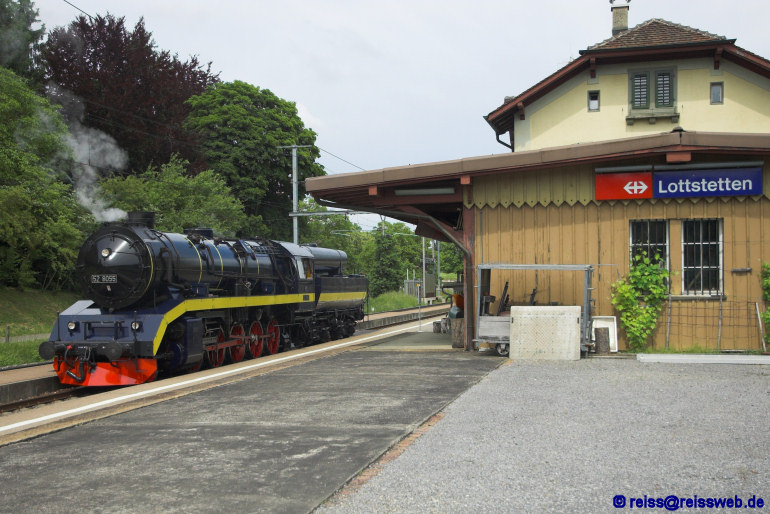 Alter Bahnhof - neue Dampflok, so könnte man dieses Bild betiteln. Meist ist es aber umgekehrt, wenn Museumsfahrzeuge auf Strecken mit Regelverkehr unterwegs sind. 52 8055 wartet in Lottstetten eine Überholung ab (30.05.2008).