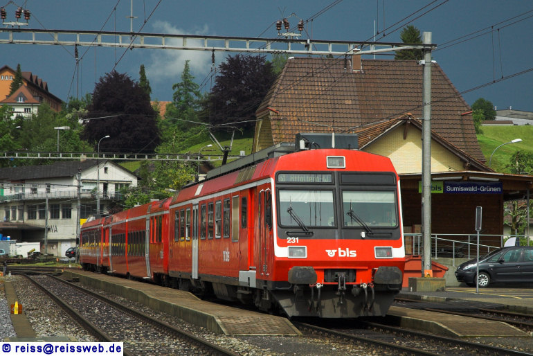 Einem abziehenden Gewitter hinterher fährt BLS RBDe 566 231 als S4 hinauf nach Affoltern-Weier (Aufnahme in Sumiswald-Grünen, 31.05.2008).