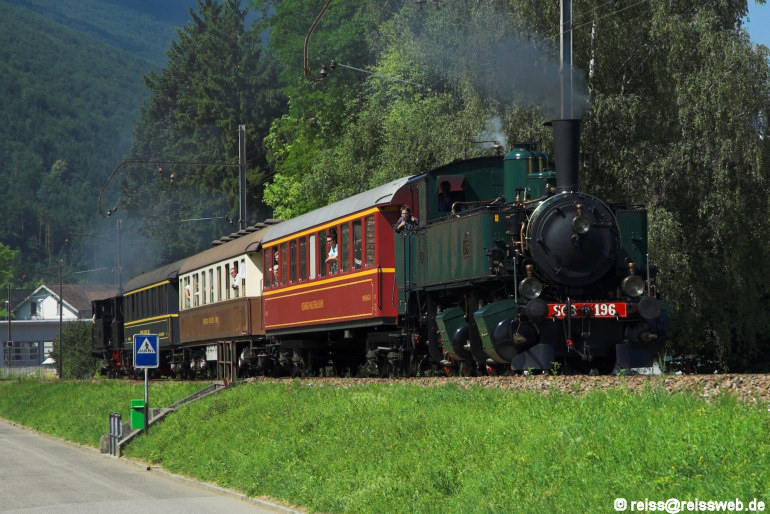 Ed 2x2/2 Nr. 196 von SBB Historic bringt zusammen mit E 3/3 Nr. 1 "Bell Josefine" und A2 Nr. 35 der ehemaligen Jura-Simplon-Bahn einen Sonderzug von Oensingen nach Balsthal (Balsthal, 28.06.2008).