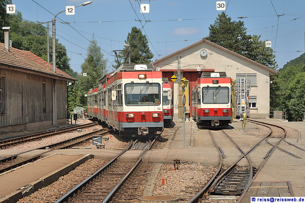 BDe 4/4 14 fährt in den Endbahnhof Waldenburg der Waldenburger Bahn ein, die als einzige Bahn in der Schweiz auf 750 mm-Spur fährt. In Waldenburg befindet sich auch das Depot (28.06.2008).
