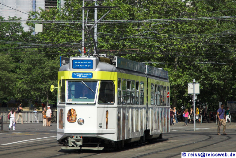 Im Frühjahr/Frühsommer 2008 war die Mirage Be 4/6 1802 der VBZ als Werbetram "Tutanchamun" für die Ausstellung "Tutanchamun – sein Grab und die Schätze" im Einsatz. Die Aufnahme entstand am 04.07.2008.