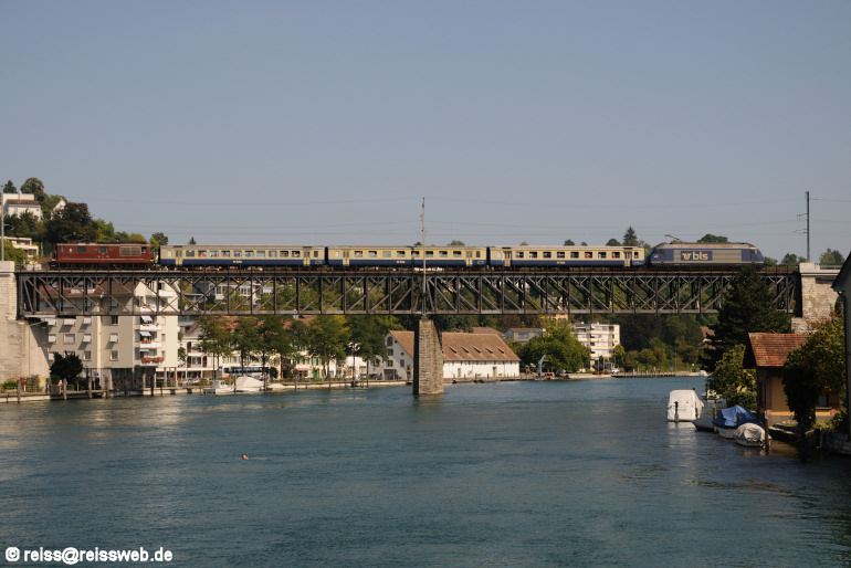 Re 4/4 171 an der Zugspitze und BLS 465 007 am Zugschluss führen den Sonderzug von Charters Helvetia über die Rheinbrücke Feuerthalen (30.08.2008).