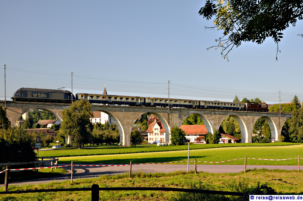 BLS 465 007 und Re 4/4 171 führen Sonderzug von Charters Helvetia über das Bussnanger Viadukt (30.08.2008).