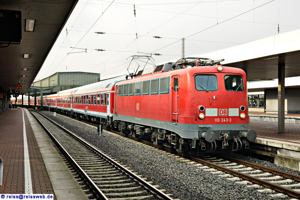 | DB AG 110 243 führt am 12.09.2008 einen Messe-Sonderzug von Köln nach Hannover Messe/Laatzen, aufgenommen in Duisburg Hbf. Dieser Zug ist überwiegend aus Bimz 546.8 (ehemalige Interregio-Wagen) gebildet, von denen DB Regio Mecklenburg- Vorpommern knapp 20 Stück im Einsatz hat (12.09.2008). |