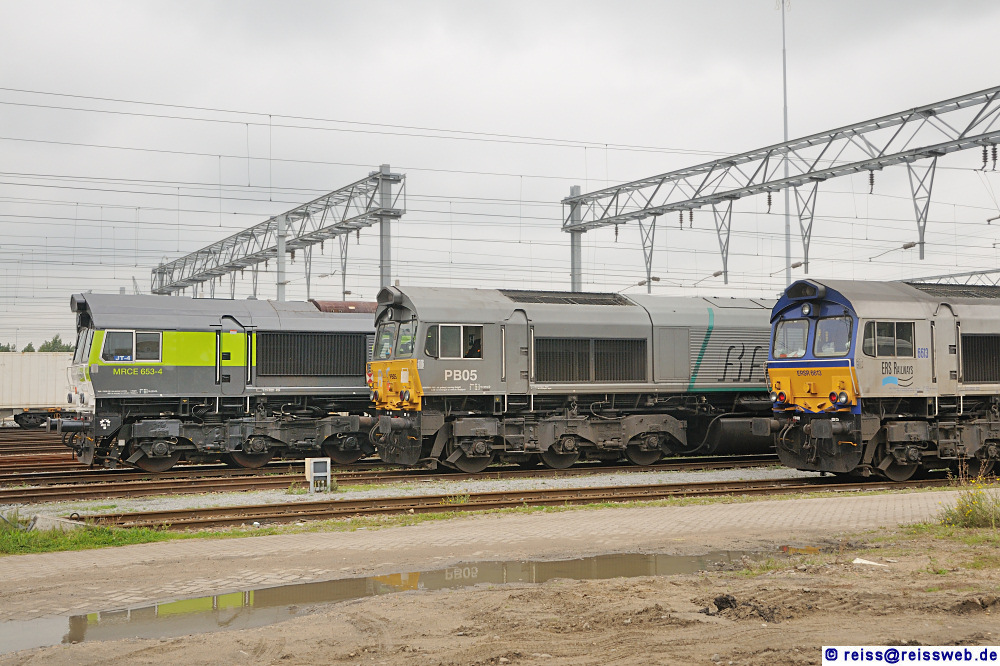 Auf den Abstellgleisen südlich des Rail Service Centers Rotterdam warten ACTS MRCE 653-4 (sie war die Prototyplok für den ERTMS/ECTS-Betrieb), Porterbrook PB 05 (vermietet an R4C) und ERS 6613 auf die nächsten Einsätze (13.09.2008).
