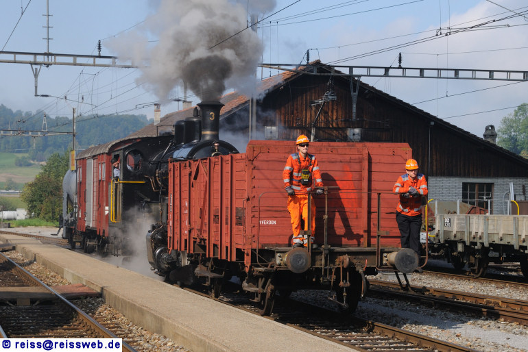 Nach einem Gastaufenthalt in Bauma beim DVZO kehrt Ec 3/5 Nr. 3 am 28.09.2008 nach Romanshorn zurück. Vor der Abfahrt werden noch einige Wagen umgestellt (Bauma, 28.09.2008).