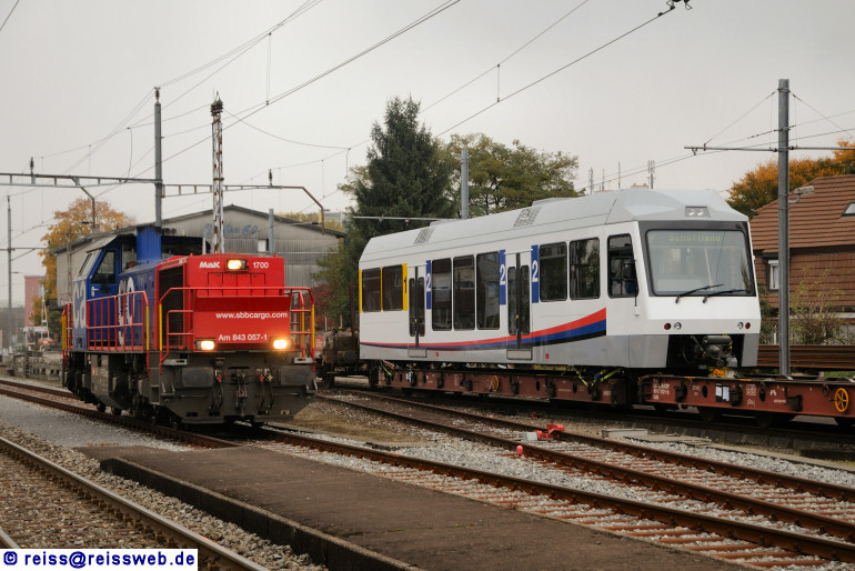 Am 843 057 hat den für die AAR bestimmten Steuerwagen in das Übergabegleis der AAR in Oberentfelden gestellt und tritt die Rückfahrt nach Lenzburg an (10.10.2008).