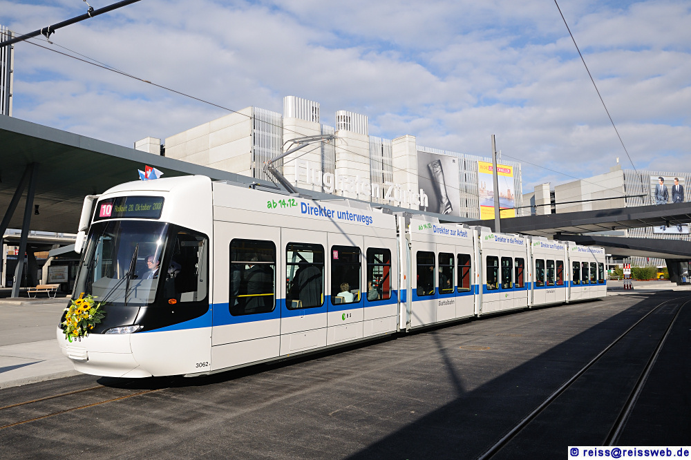Medienfahrt der Glatttalbahn am 20. Oktober 2008 mit dem in Lackierung der Glattalbahn ausgeführten Wagen 3062 aus der Cobra-Serie. Die eigentliche Eröffnung findet zum Fahplanwechsel im Dezember 2008 statt. (ZH Flughafen, 20.10.2008).
