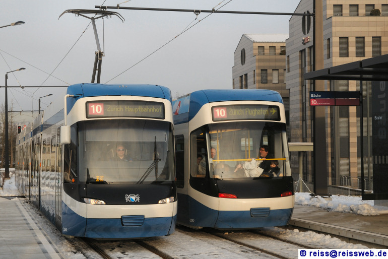 | Cobra-Treffen (links 3060, rechts 3052) in der Haltestelle Bäuler, wo sich beim 15-Minuten-Takt die Fahrzeuge in etwa begegnen sollten. Eine Viertelstunde später hätte es eine weiss-blaue Begegnung gegeben - die fand dann leider in der Haltestelle Unterriet statt... (04.01.2009). |