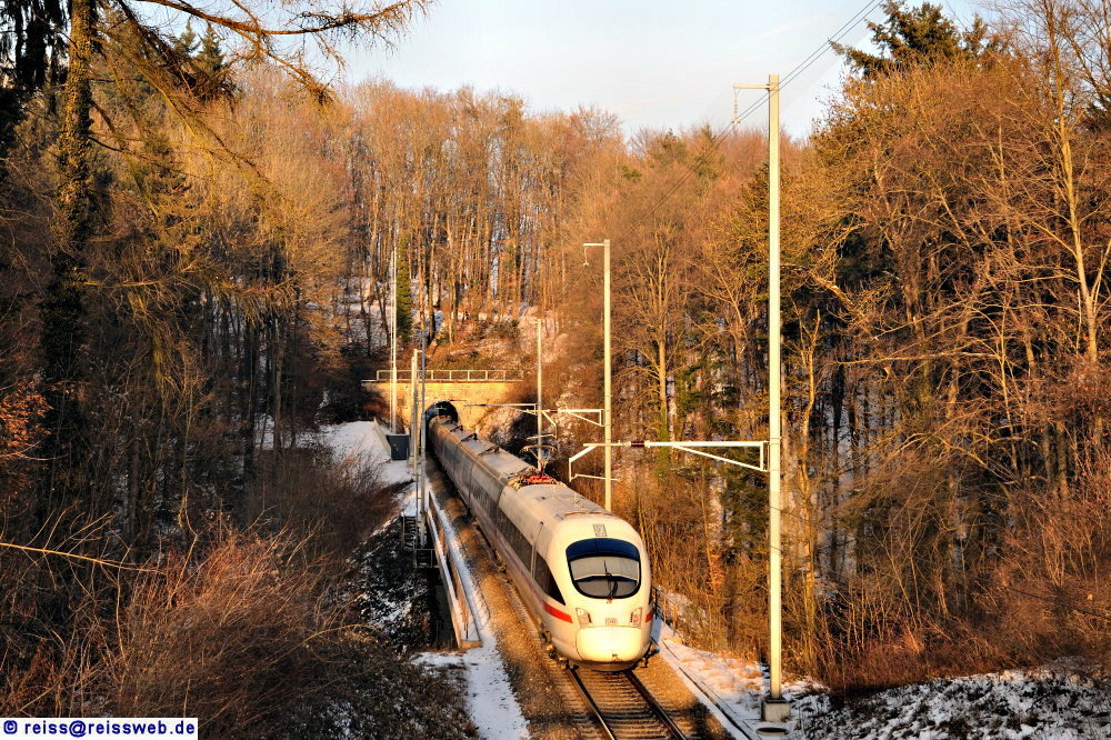 Pünktlich und im besten Licht verkehrte ICE 184 am 17.01.2009 von Zürich nach Stuttgart, aufgenommen wurde er zwischen den Stationen Altenburg-Rheinau und Neuhausen.