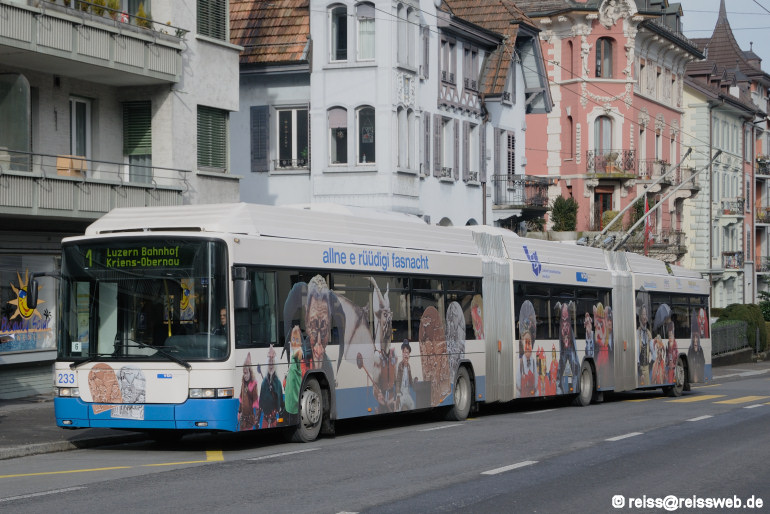 Rechtzeitig zur Fasnacht 2009 wurde der Luzerner Doppelgelenk-Trolleybus (DGT) 233 mit einem passenden Sujet versehen. Dieser Bus trug zuvor als Eigenwerbung eine fast 25 m lange Raupe auf den Seitenwänden (Luzern Weggismatt, 21.01.2009).