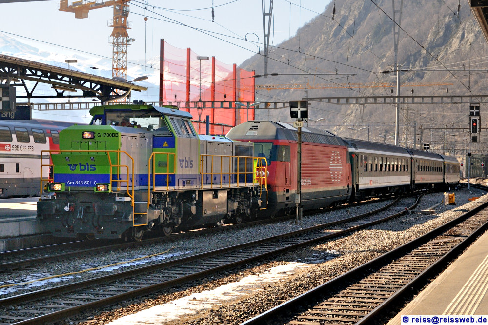 Unternehmensübergreifende Hilfe im Störungsfall? Der Schein trügt: Die BLS-Lokomotive Am 843 501, die SBB 460 034 samt einer IC-Garnitur abschleppt, war (zum Aufnahmezeitpunkt) an die SBB vermietet (Brig, 28.02.2009).