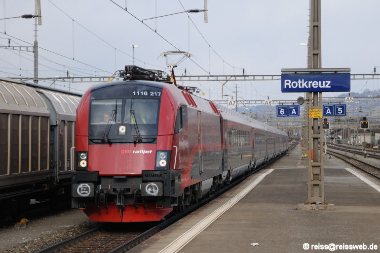 Auf einer Präsentationsfahrt in der Schweiz erreicht der Railjet den Bahnhof Rotkreuz (19.03.2009).