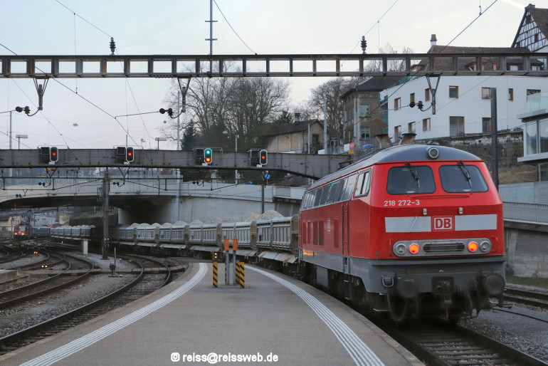 Am Abend des 03.04.2009 verlässt ein Aushubtransport der Durchmesserlinie mit 218 249 an der Spitze und 218 272 als Schublok den Bahnhof Schaffhausen Richtung Wilchingen-Hallau.