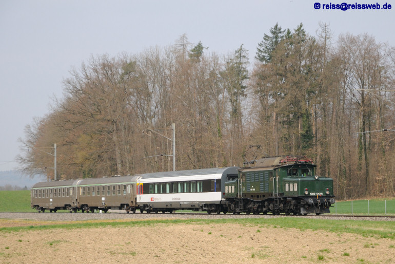 Die ehemalige 1020.042 der ÖBB ist am 04.04.2009 mit einem Sonderzug von Oberriet nach Hüntwangen-Wil unterwegs. Aufgenommen wurde sie nördlich Marthalen.