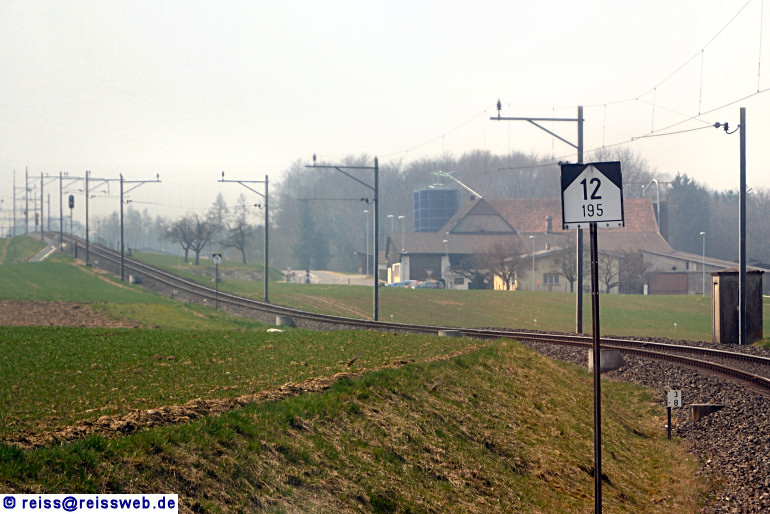 Einfahrt in den Bahnhof des Waffenplatzes Bure - das Einfahrsignal befindet sich knapp vor dem Ende des 44‰ steilen Abschnitts (05.04.2009).