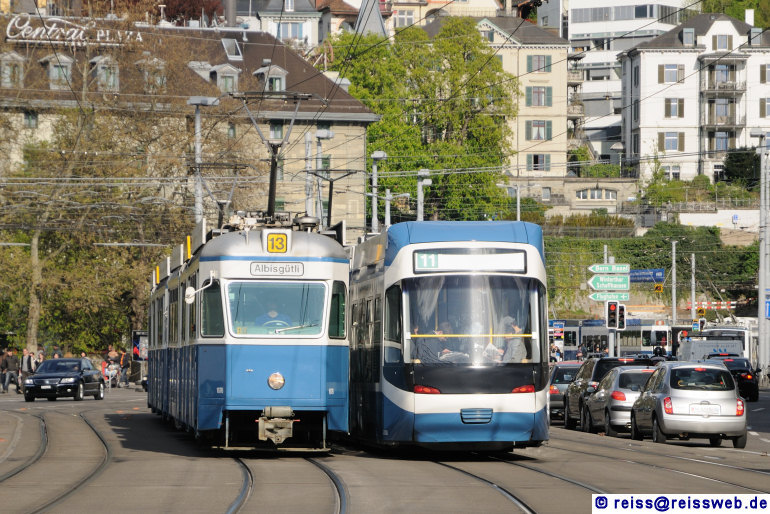 Vor dem Zürcher Hauptbahnhof begegnen sich eine "Mirage" (Be 4/6 1679) und Cobra 3038 (17.04.2009).