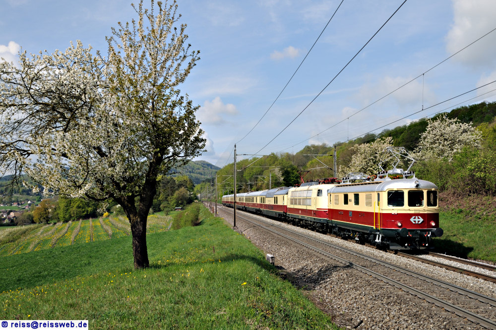 Die Re 4/4 I 10034 und die 103 184 der DB waren am Ostersamstag 2009 von Basel nach St. Margrethen - (Lindau) unterwegs. Die Aufnahme entstand bei Umiken an der Bözbergsüdrampe (18.04.2009).